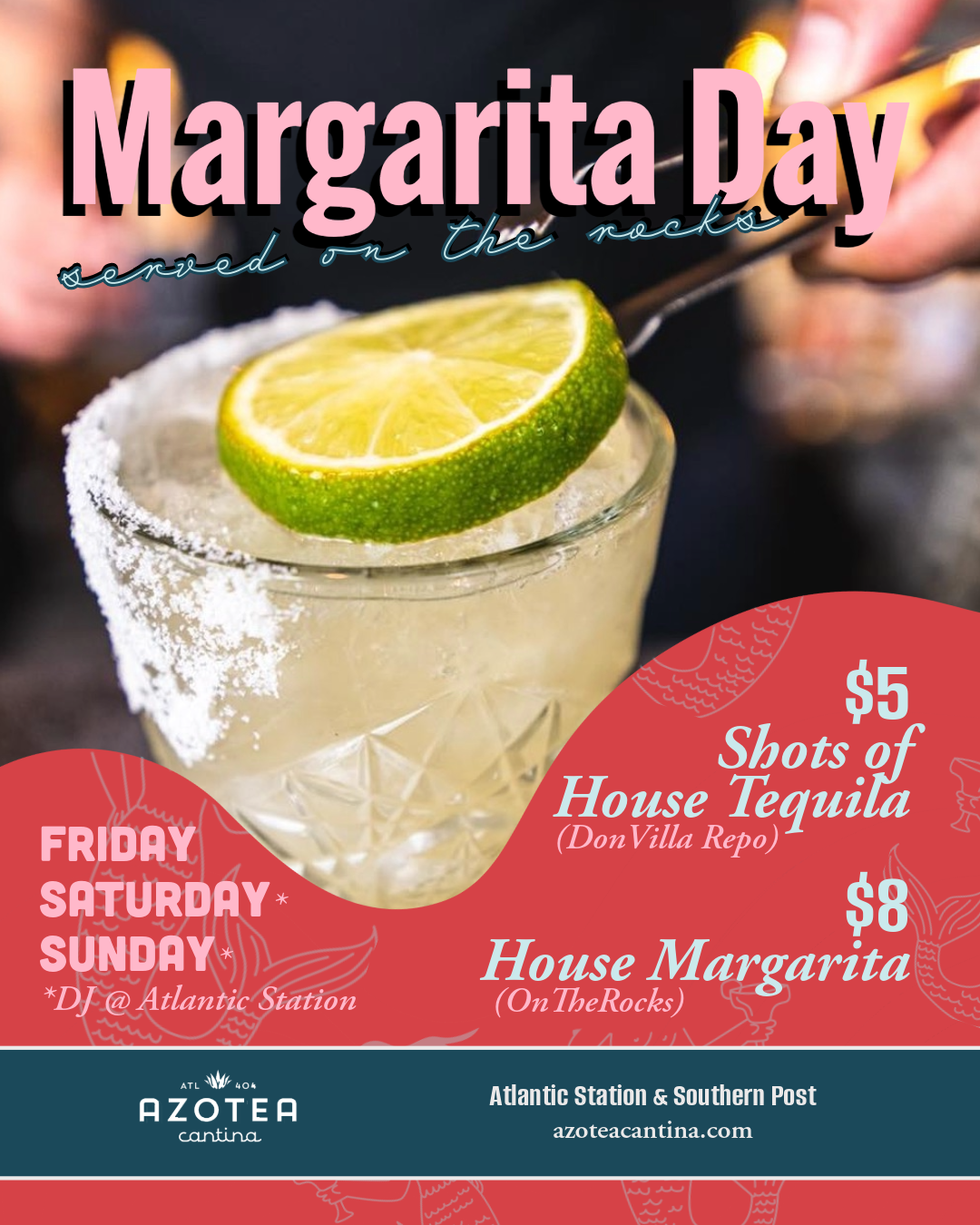 If it clinks, it drinks. Celebrate Margarita Day with every sip served on the rocks. Join Us at Atlantic Station & Southern Post Friday to Sunday $5 shots of house tequila (Don Villa Repo) $8 House Margarita (On the rocks) DJ Saturday & Sunday @atlanticstation